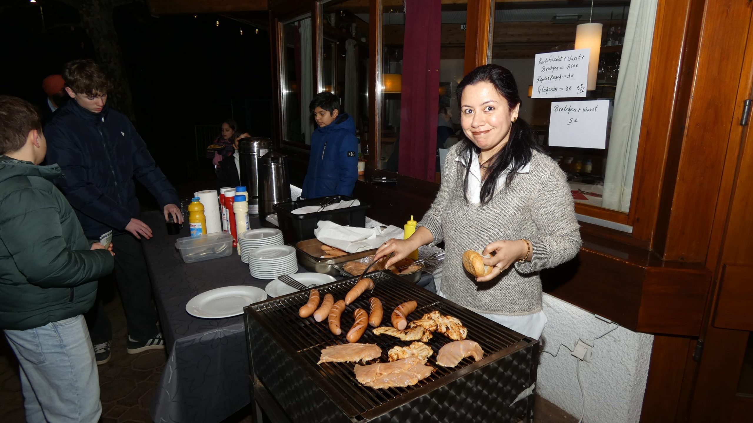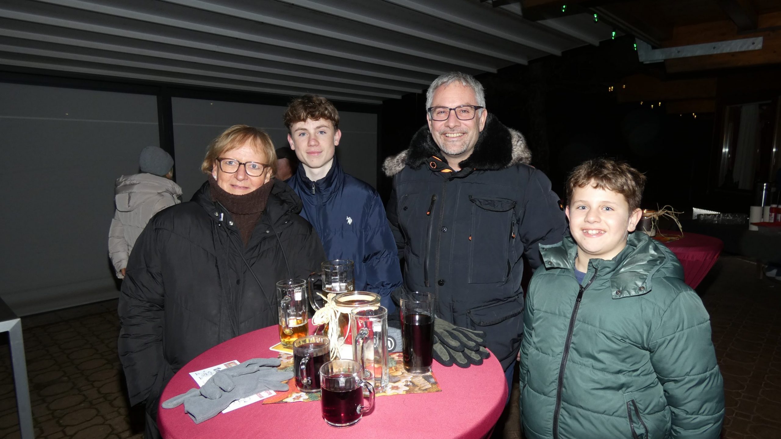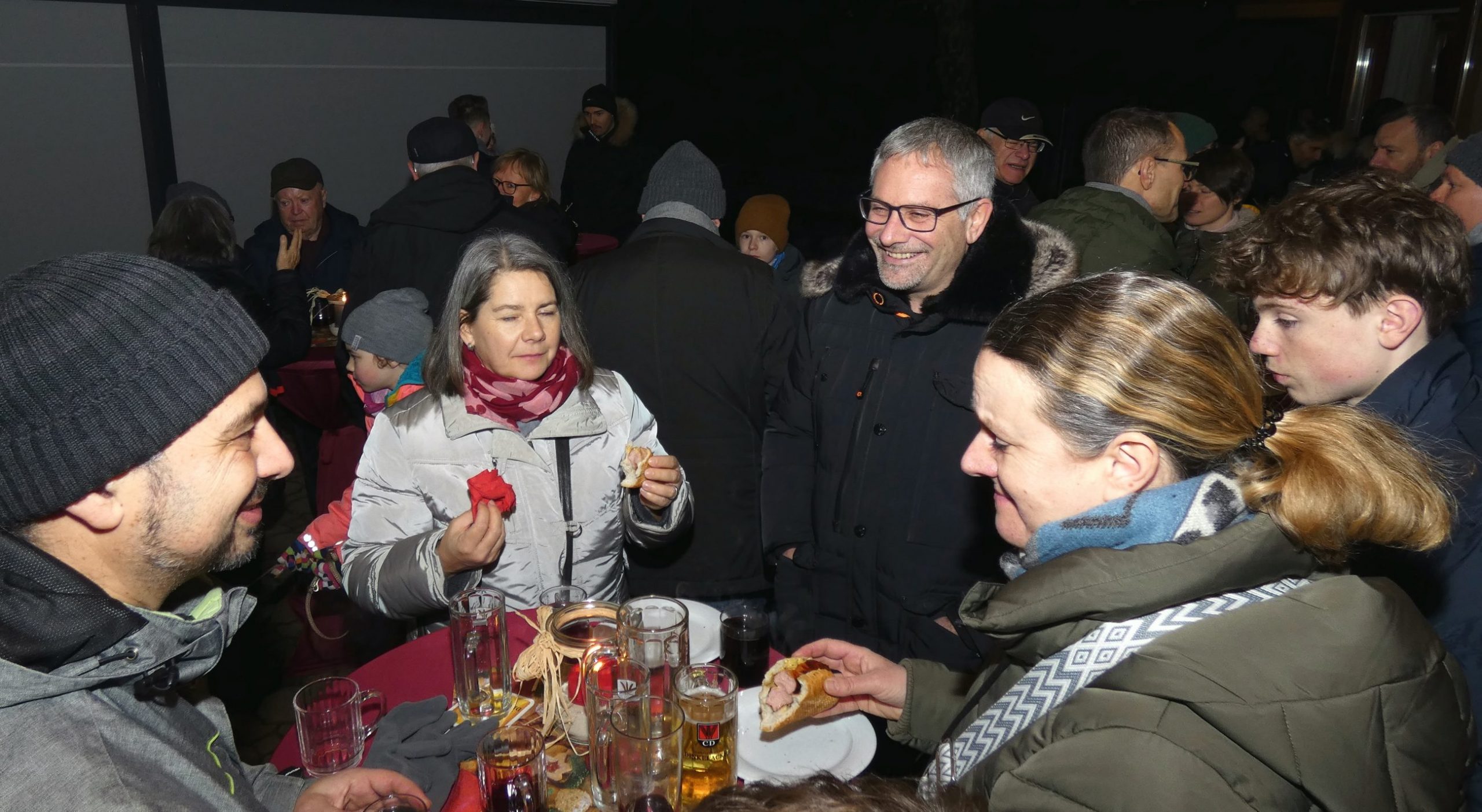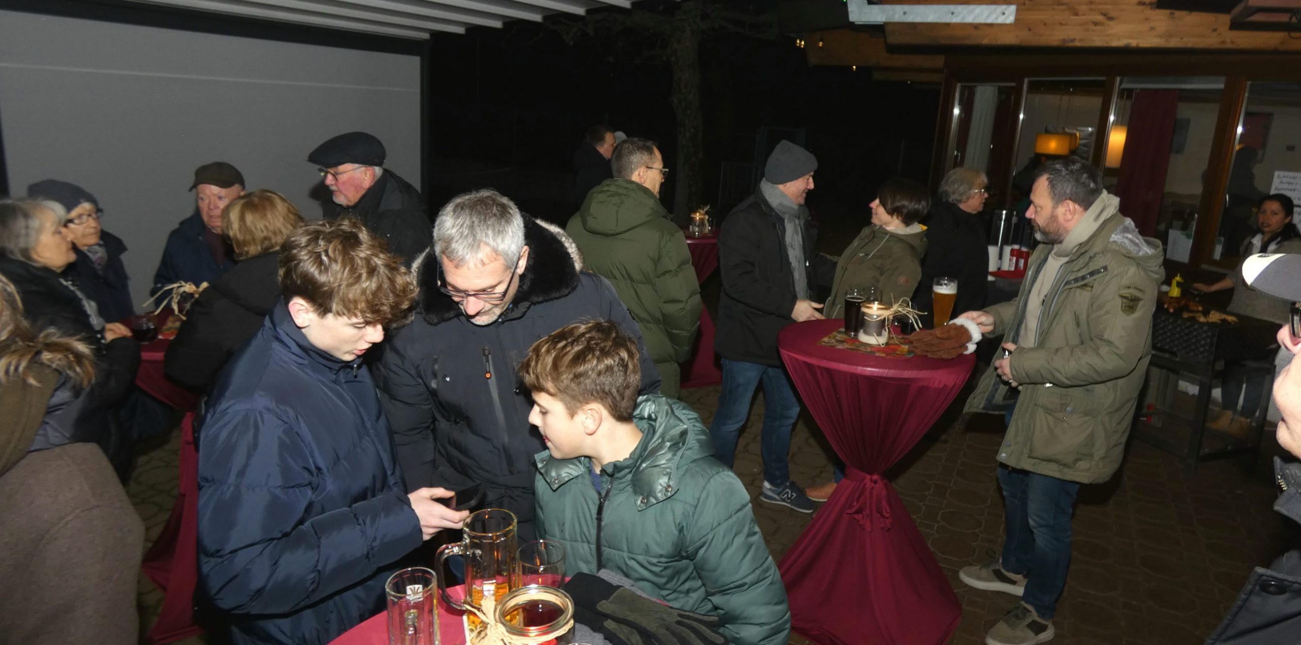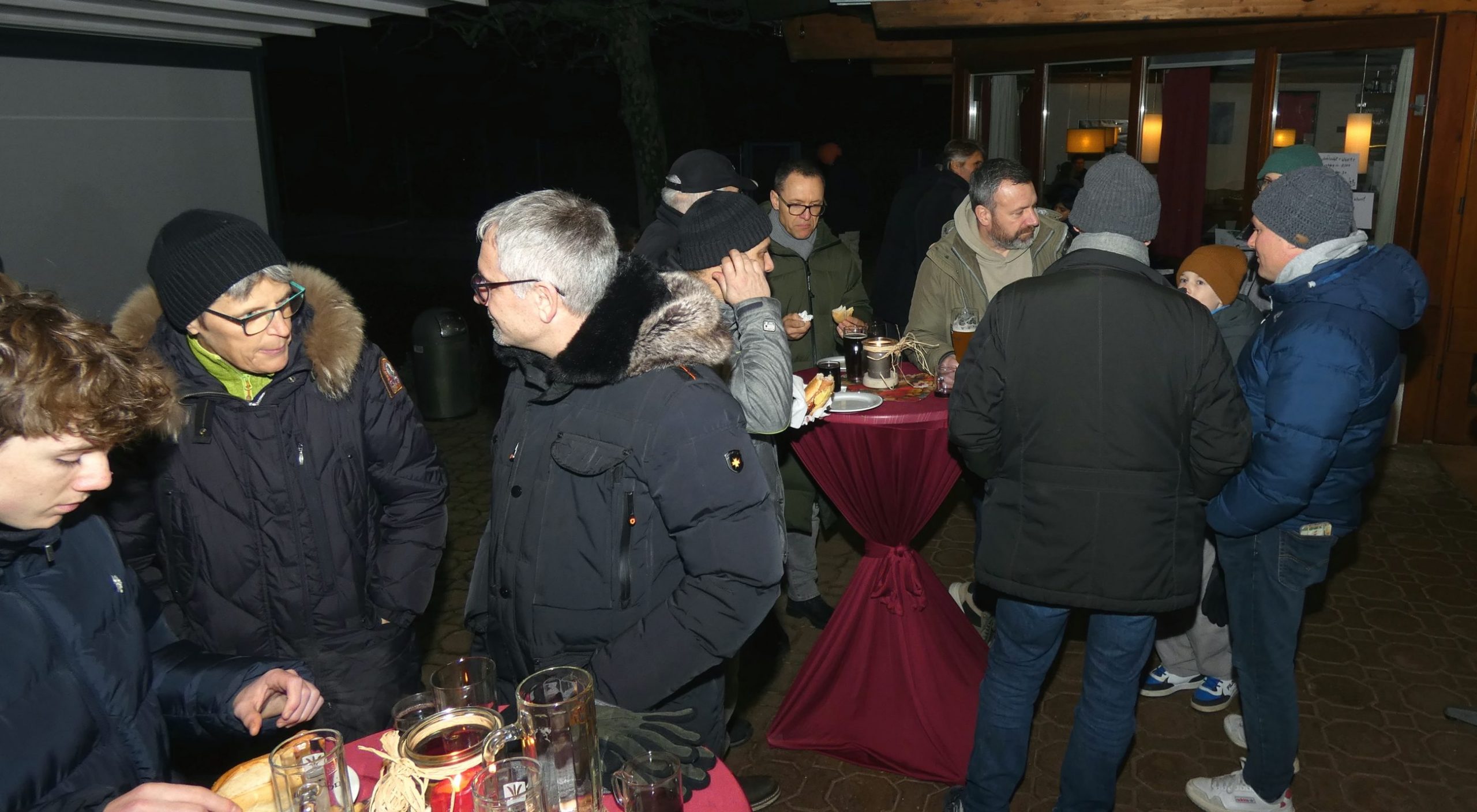 Ab 19:00 Uhr traf man sich anschließend auf der Terrasse der TVB-Gaststätte. Für das leibliche Wohl sorgten unsere neue Pächter Poonam und ihr Mann mit roten Würsten im Brötchen, selbst gemachtem Kartoffelsalat sowie Hähnchensteaks vom Grill. Dazu wurden Punsch und Glühwein angeboten. In entspannter Runde entstanden gute Gespräche und ein angenehmes Beisammensein.