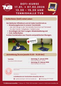stellt euch vor, wir haben einen Defibrillator – aber im Ernstfall traut sich keiner ran! Um dem vorzubeugen, bieten wir gemeinsam mit den Maltesern Defi-Kurse in unserer Tennishalle an. Unser Defi, vor vielen Jahren von den Maltesern gespendet, hängt in der Halle (Nebenraum neben Getränkeautomat). Im Sommer findet ihr ihn vorne im Schrank auf der Terrasse.